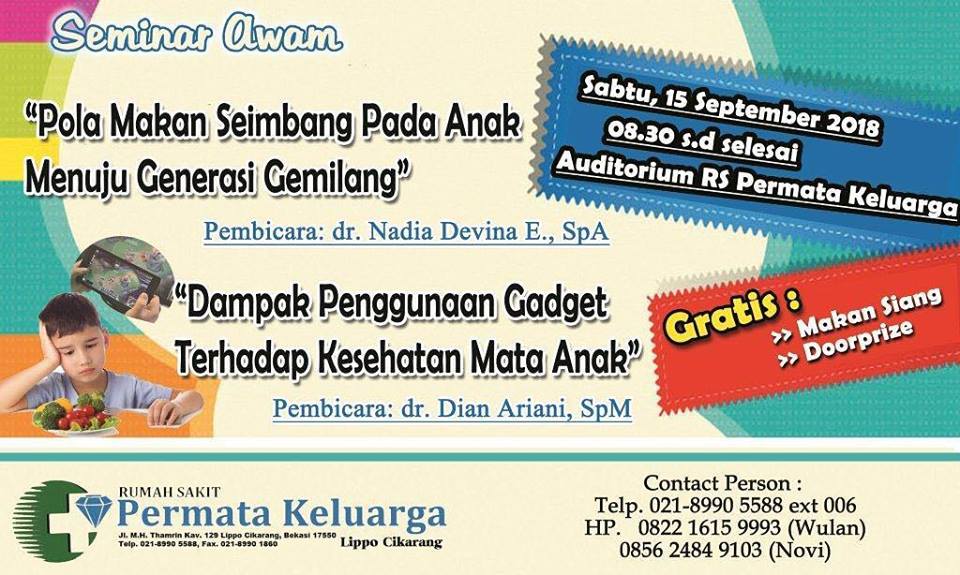 Sahabat Permata, Kami mengundang Bapak / Ibu untuk mengikuti Seminar Awam di RS. Permata Keluarga Lippo Cikarang dengan tema " Pola Makan Seimbang Pada Anak Menuju Generasi Gemilang dan Dampak Penggunaan....